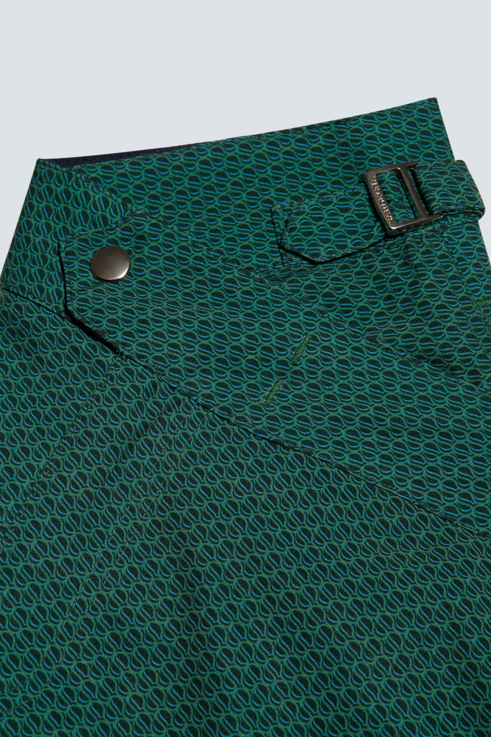 - Bolso posterior com vivo único e fechamento em zíper;