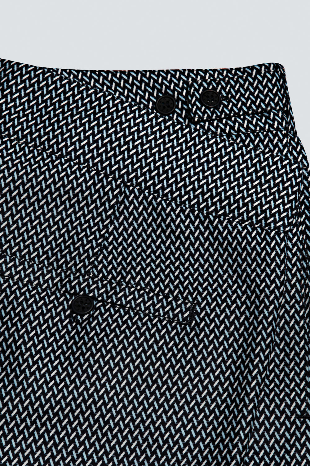 • Bolso posterior com vivo único e abotoamento